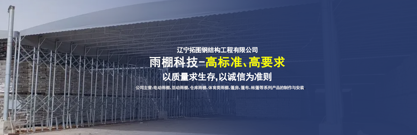 遼寧拓圖鋼結(jié)構(gòu)工程有限公司是一家專業(yè)從事推拉篷設(shè)計(jì)、制作、安裝、使用、維修的綜合性公司。公司主營:電動(dòng)雨棚、活動(dòng)雨棚、倉庫雨棚、體育類雨棚、篷房、篷布、帳篷等系列產(chǎn)品的制作與安裝。    遼寧拓圖鋼結(jié)構(gòu)工程有限公司堅(jiān)持以市場為導(dǎo)向,以科技創(chuàng)新為動(dòng)力,以質(zhì)量求生存,以誠信為準(zhǔn)則,倡導(dǎo)求實(shí)、進(jìn)取、創(chuàng)新的企業(yè)精神。“科學(xué)的管理、嚴(yán)謹(jǐn)?shù)脑O(shè)計(jì)、 的制作安裝、嚴(yán)格的質(zhì)量檢測、良好的后期服務(wù)成就企業(yè)的信譽(yù),為您提供優(yōu)質(zhì)服務(wù)。    遼寧拓圖鋼結(jié)構(gòu)工程有限公司傾力于開發(fā)應(yīng)用三維空間結(jié)構(gòu)與新材料的結(jié)合,將廣告藝術(shù)視覺表現(xiàn)形式與張力膜材科學(xué)的結(jié)合,推出多彩推拉蓬,依靠先進(jìn)的科學(xué)技術(shù),將推拉蓬建筑表現(xiàn)形式無限延伸,立志走在建筑科學(xué)的前沿,引導(dǎo)建筑時(shí)尚潮流,我們的目標(biāo)是使推拉蓬建筑在中國發(fā)展壯大。    遼寧拓圖鋼結(jié)構(gòu)工程有限公司憑著極強(qiáng)的事業(yè)熱情和豐富的專業(yè)經(jīng)驗(yàn)以“勤勉進(jìn)取、銳意創(chuàng)新、至誠至信”的精神使公司得到迅速健康發(fā)展,業(yè)務(wù)范圍遍及全國。科學(xué)的管理、嚴(yán)謹(jǐn)?shù)脑O(shè)計(jì)、高標(biāo)準(zhǔn)的制作安裝流程,嚴(yán)格把控產(chǎn)品質(zhì)量,熱誠的售后服務(wù)是企業(yè)競爭力的源泉。    遼寧拓圖鋼結(jié)構(gòu)工程有限公司人愿以最誠摯的態(tài)度,歡迎廣大客戶的蒞臨與溝通!愿為市場提供優(yōu)...